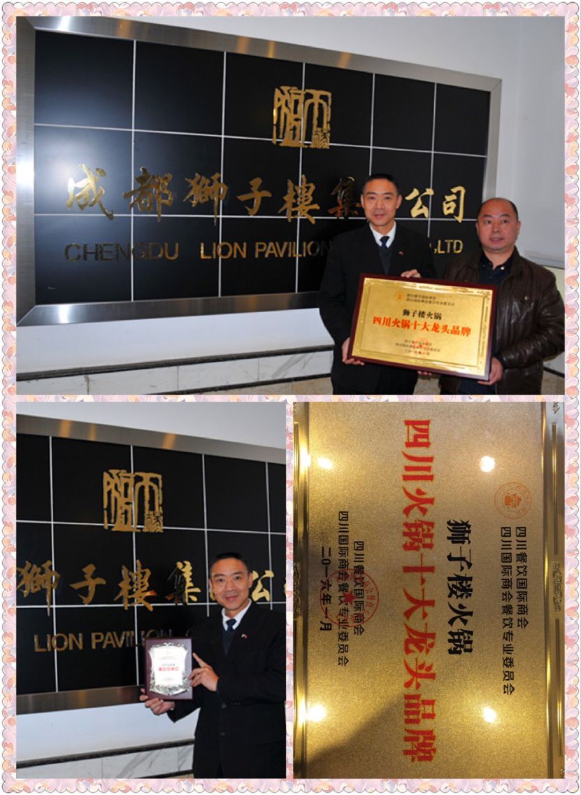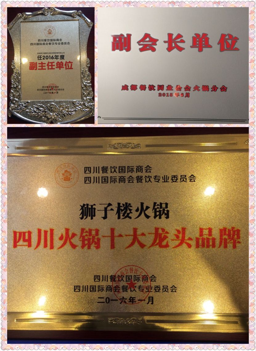 2016年开年伊始,成都狮子楼凭借其在四川餐饮行业的地位及影响力,以及近年来狮子楼将中国民族餐饮文化不断向全国及海外拓展,并取得了一些列丰硕的成果,因此,频频获得政府部门及行业协会的多项殊荣。 2016年1月18日,四川餐饮国际商会、四川国际商会餐饮专业委员会的有关领导亲自上门来到成都狮子楼集团本部,特授予成都狮子楼火锅“四川火锅十大龙头品牌”,特授予成都狮子楼餐饮发展管理有限公司2016年度“副主任单位”。