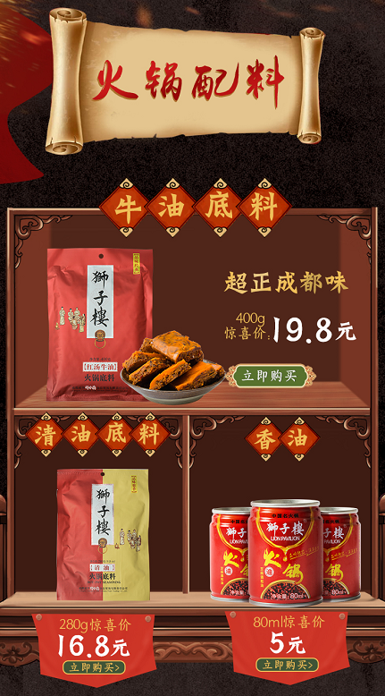 狮子楼天猫旗舰店在2017年11月赶在双11前上线啦,狮子楼给各位好吃嘴奉上懒人系列快餐火锅,还有狮子楼特制的红汤牛油火锅底料、清油火锅底料、火锅油碟等。让你品味到正中大品牌、地道老成都的火锅,给你带来脆生生、爽嫩嫩、卤滋滋、滑溜溜的极致口感。