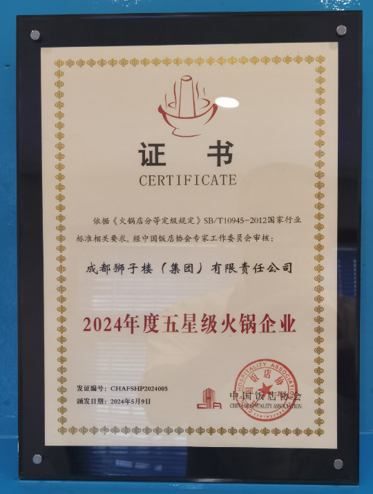 2024年5月9日,在成都举办的第14届中国火锅产业大会上,成都狮子楼集团公司因其餐饮门店卓越的品质和规模,再次荣获由中国饭店协会颁发的