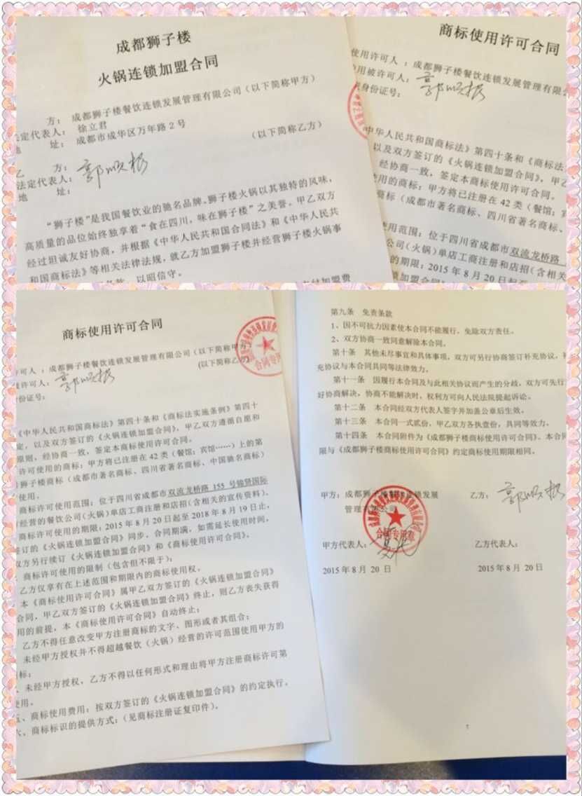 郭顺根总经理通过多年对狮子楼火锅的品尝和考察,同时与其它火锅反复对比,最终选择狮子楼这个值得他信赖的大品牌加盟。2015年8月20日上午,郭先生亲自前来狮子楼集团总部,愉快地与成都狮子楼餐饮连锁发展管理公司总经理莫正伦先生签订了连锁加盟合同